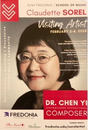 As the inaugural Claudette Sorel Visiting Artist at the State University of New York at Fredonia, composer Chen Yi returned to the School of Music in early February for a second residency week. The acclaimed composer, who was born in China and lived through the Cultural Revolution, has written for seemingly every combination of instruments, voices and ensembles. Over 300 students and faculty met with her for rehearsals, master classes and concerts of her music. Fredonia is where Claudette Sorel taught for many years; she was the first woman named Distinguished University Professor in the entire SUNY system. Chen Yi’s residency also included a “Women in Music” roundtable panel with Sorel Organization Managing Director Wende Persons. View Sorel residency events on the School of Music’s YouTube LIVE page.
